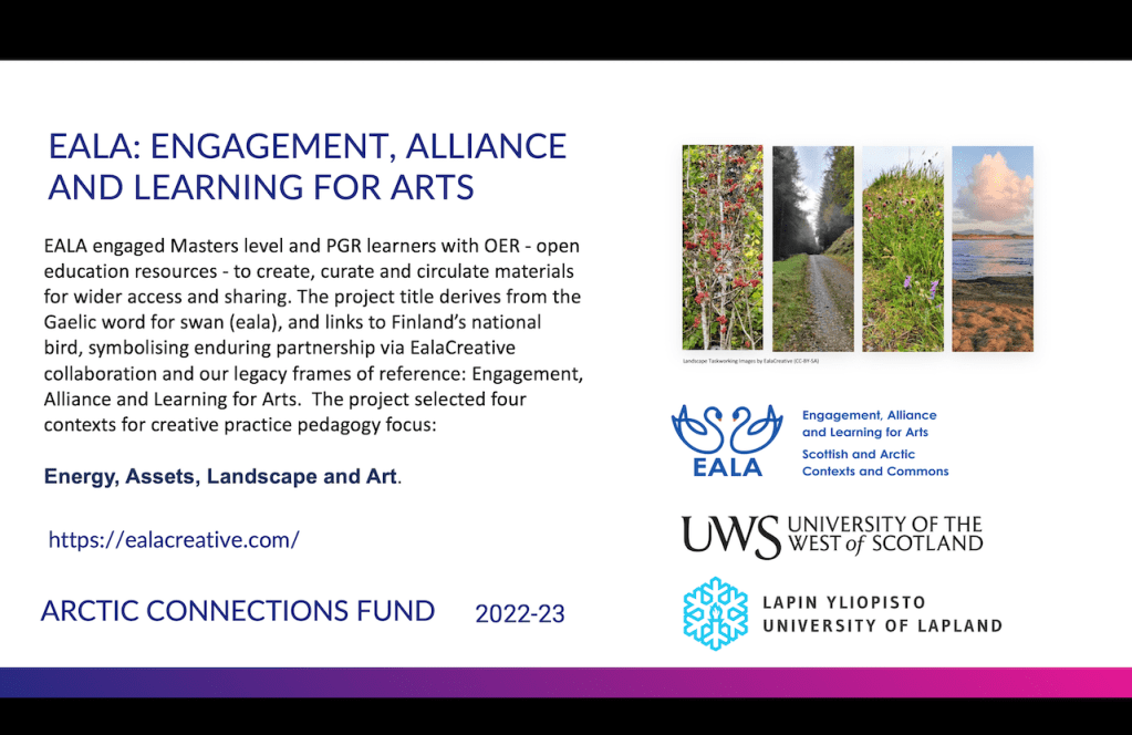 This EALA learning exchange project (2022-2023) explored Scotland’s links to the Arctic through an OER focus for learning and creativity exchange. OER – open education resource – is a process and ambition to create, curate and circulate materials and artifacts such as images, texts and documents for wider access and sharing. EALA as a title also offers us a simple summary of the project’s frame of reference: Engagement, Alliance and Learning for Arts. Please click on the menu for more information and we look forward to sharing our artefacts and reflections with you.
